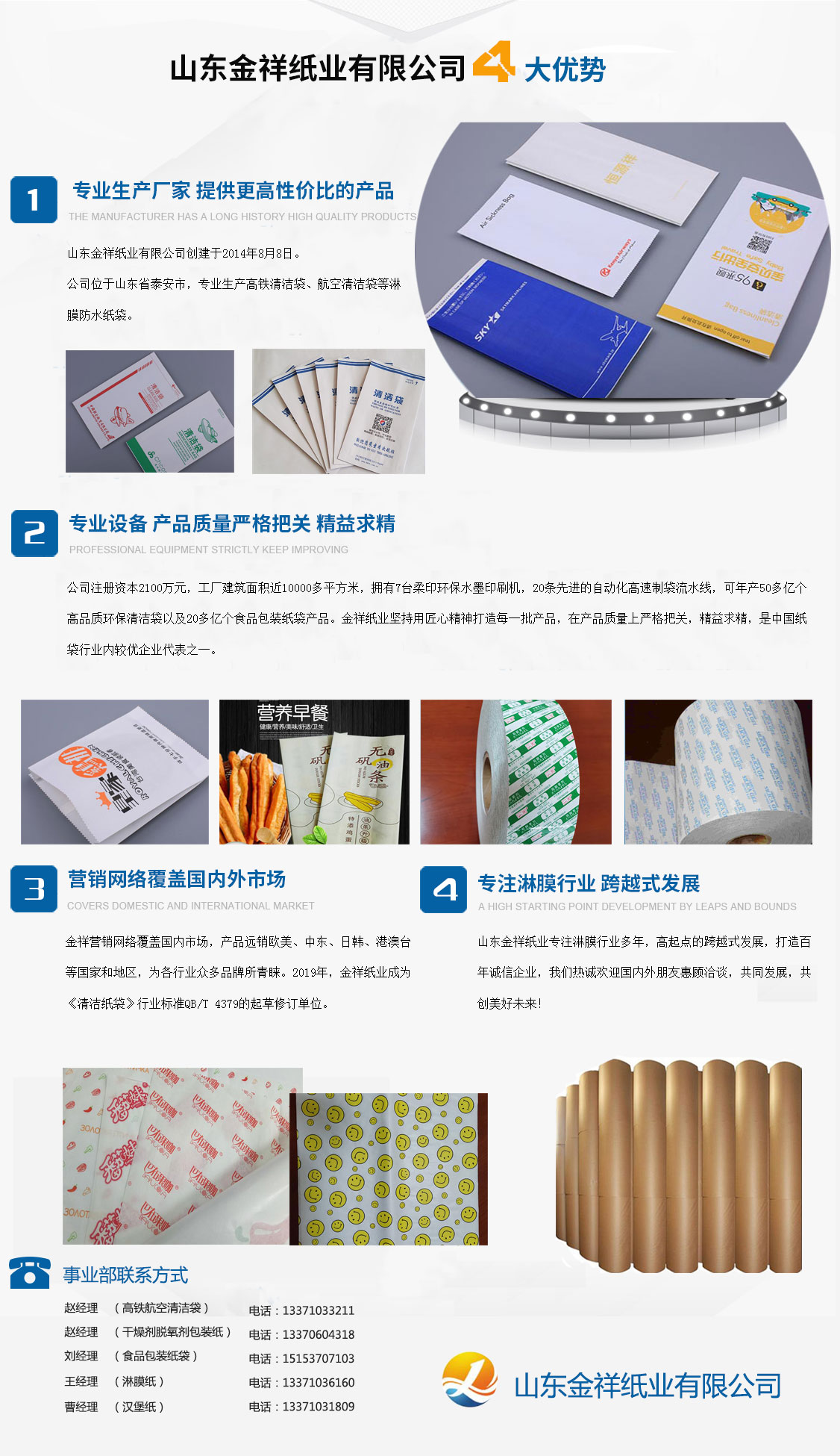 山東金祥紙業(yè)有限公司創(chuàng)建于2014年8月8日,公司位于山東泰安,專業(yè)生產(chǎn)高鐵清潔袋、航空清潔袋等淋膜防水紙袋。公司注冊資本2100萬元,工廠建筑面積近10000多平方米,擁有7臺柔印環(huán)保水墨印刷機,20條先進的自動化高速制袋流水線,可年產(chǎn)50多億個高品質環(huán)保清潔袋以及20多億個食品包裝紙袋產(chǎn)品。金祥紙業(yè)堅持用匠心精神打造每一批產(chǎn)品,在產(chǎn)品質量上嚴格把關,精益求精,是中國紙袋行業(yè)內較優(yōu)企業(yè)代表之一。金祥營銷網(wǎng)絡覆蓋國內市場,產(chǎn)品遠銷歐美、中東、日韓、港澳臺等國家和地區(qū),為各行業(yè)眾多品牌所青睞。2019年,金祥紙業(yè)成為《清潔紙袋》行業(yè)標準QB/T 4379的起草修訂單位。